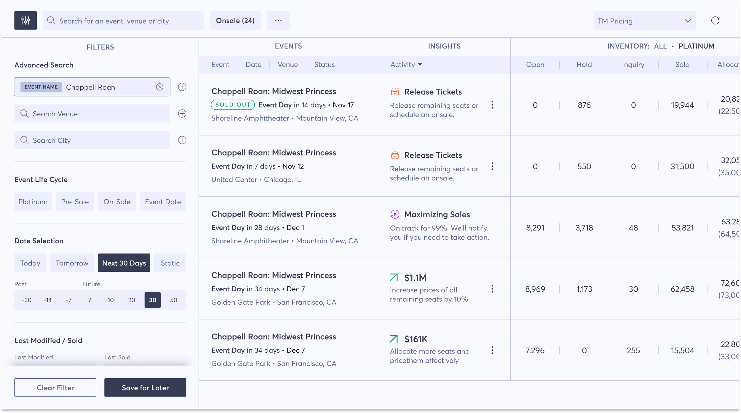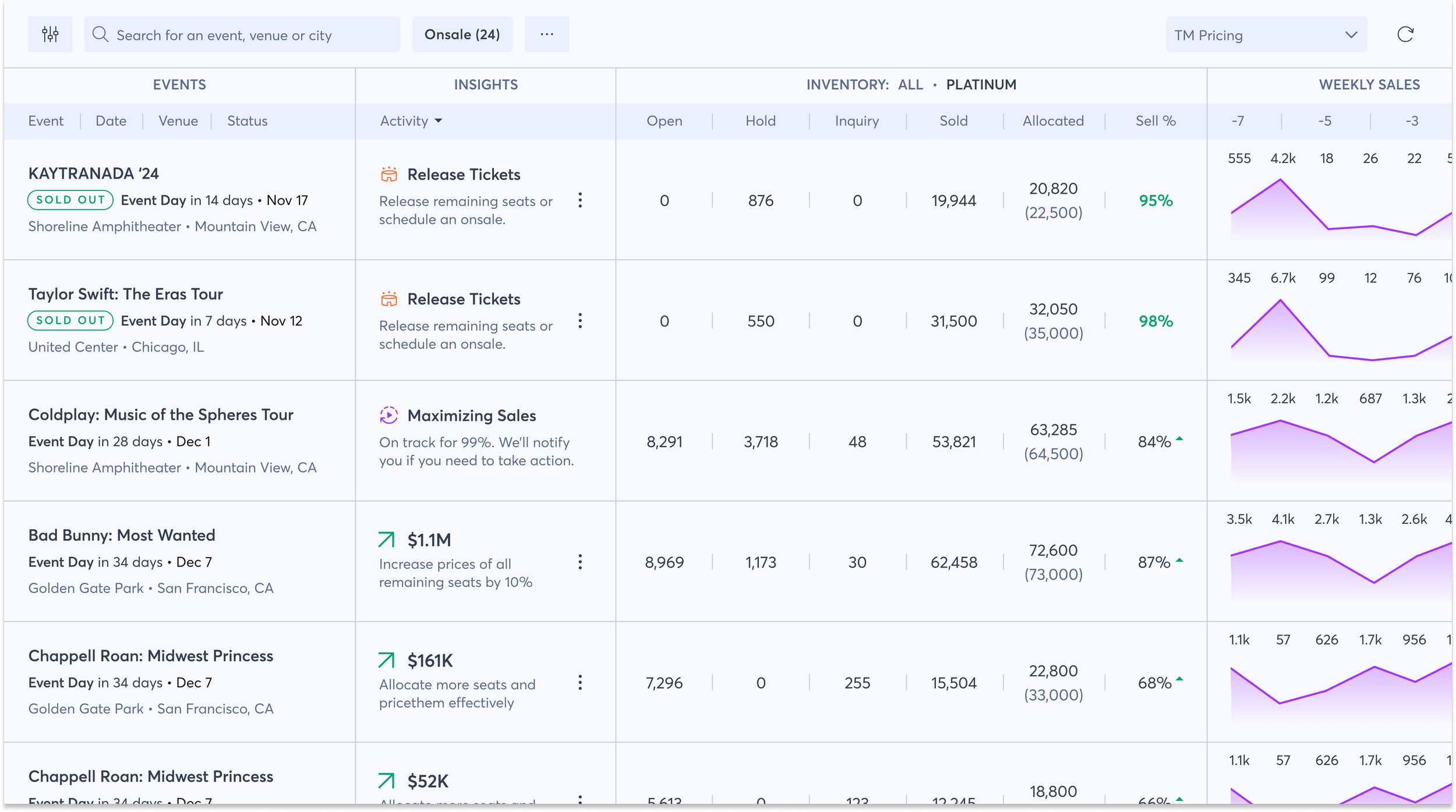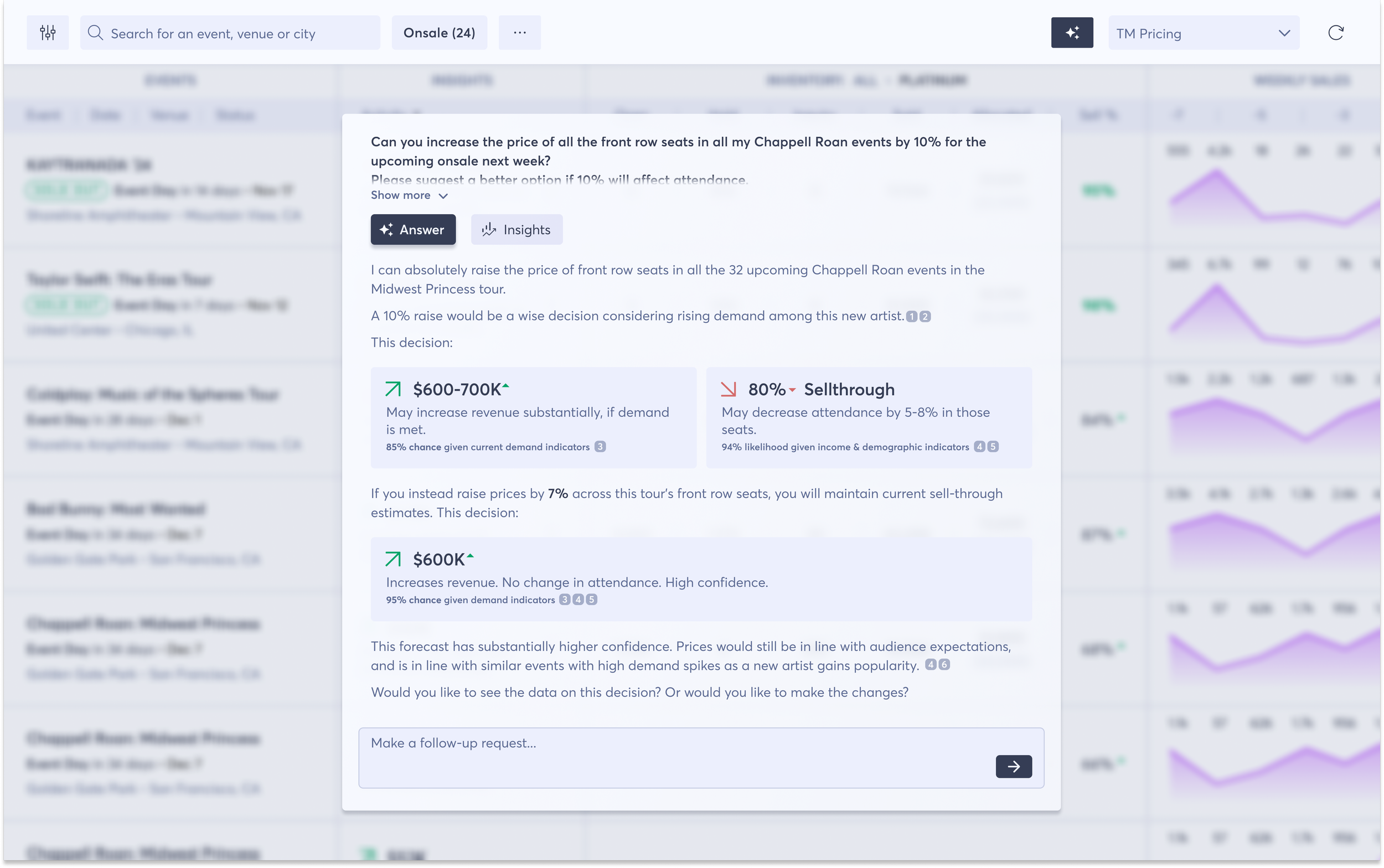 A smart assistant that does the rest. Let AI insights help you schedule your next onsale, or price groups of seats across multiple events.